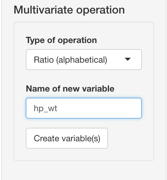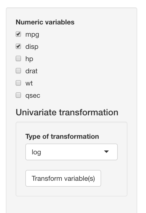 For a single numeric variables, this tab supports log and square-root transformation under the “Univariate transformation” section. Below is an example of log-transforming two variables (mpg and disp). Users can select all variables to transform and type of transformation on the left input panel.