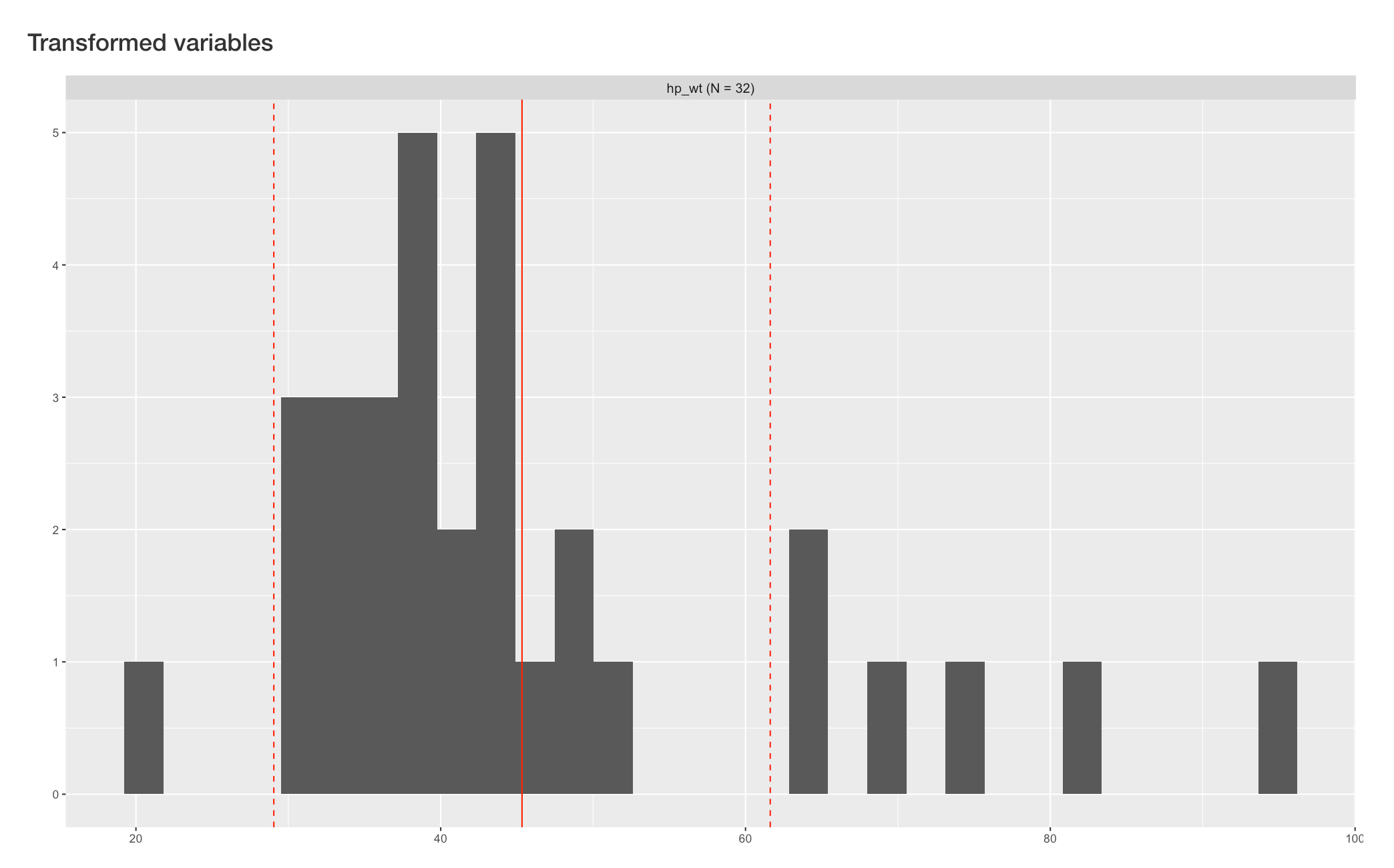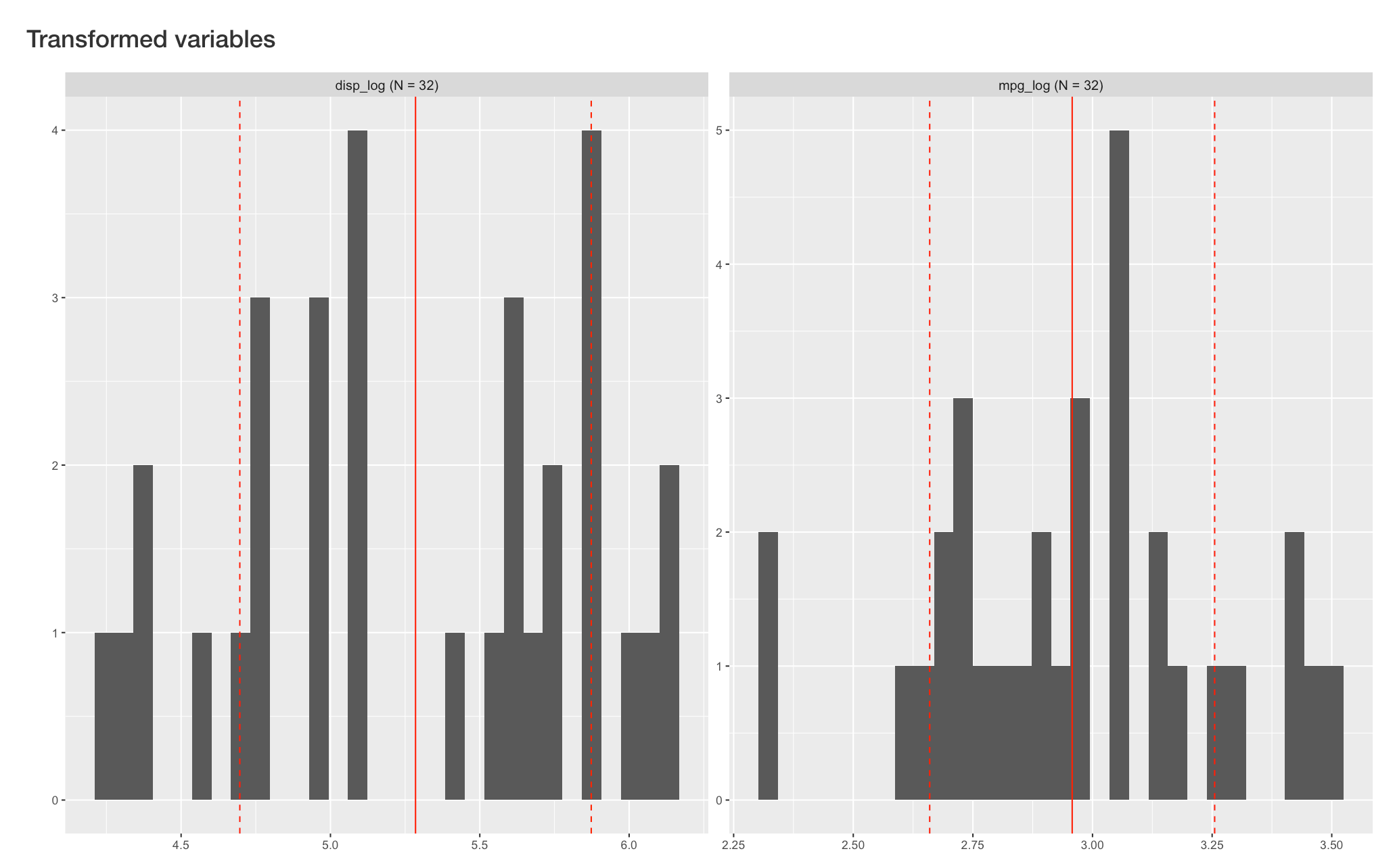 After clicking the “Transform variable(s)” button, histograms of new variables will show up reactively on the right side, below original variables. VisXplore will name the new variable by adding the type of transformation after the original variable names (e.g. disp_log).