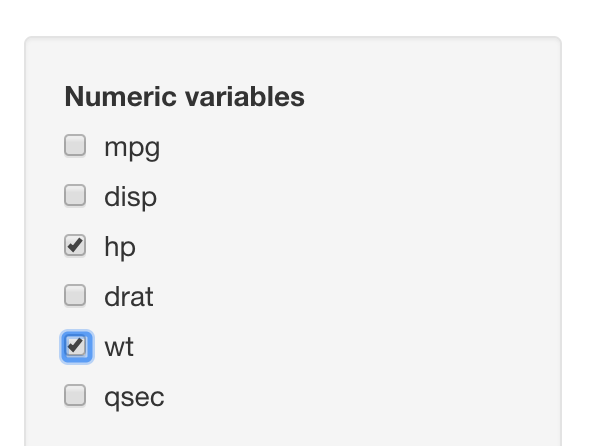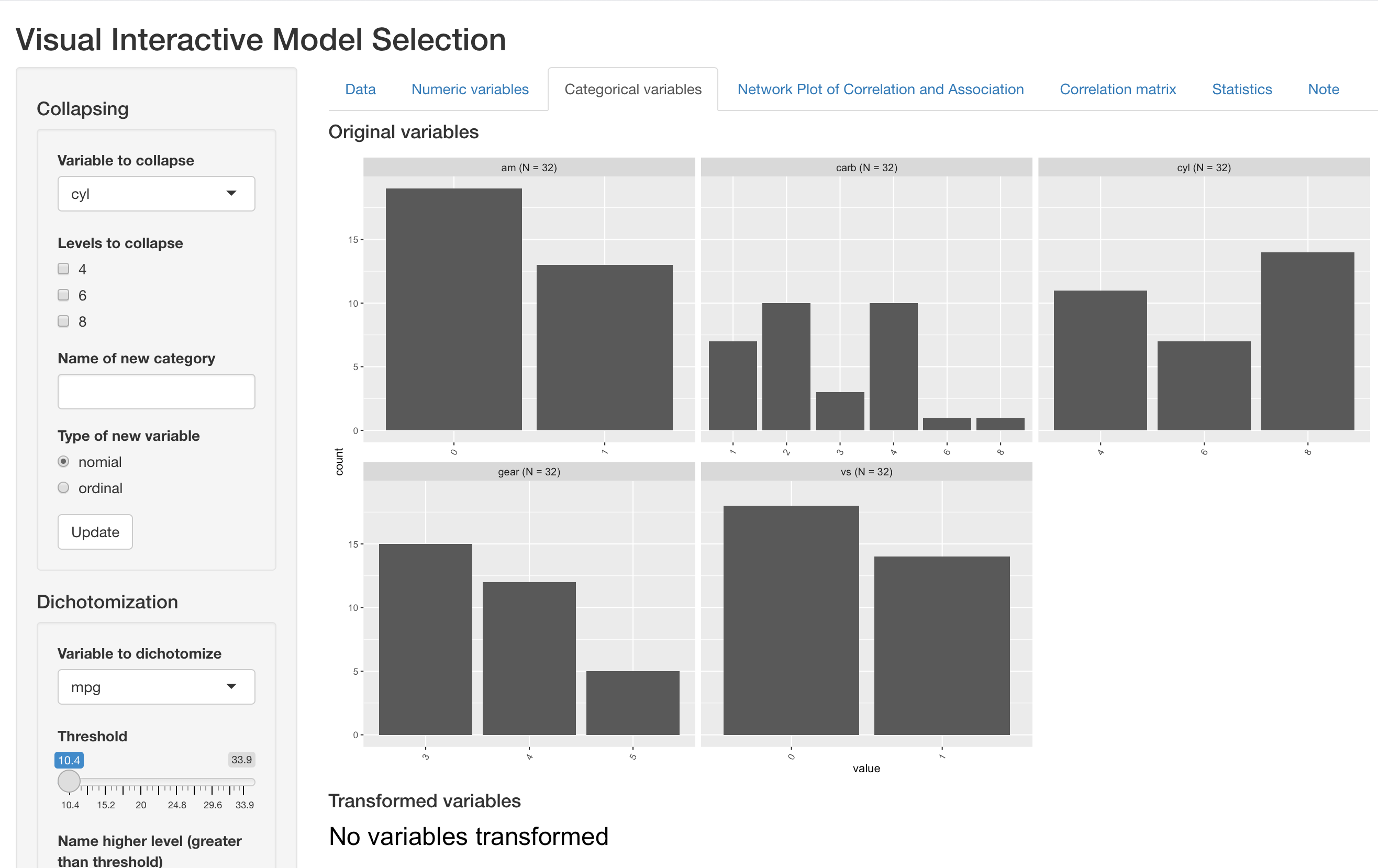 The VisXplore application includes five tabs, supporting operations of data pre-processing or variable selection. Each tab consists of an input panel on the left side and an output panel on the right side. In the following sections, we will illustrate the VisXploreplore workflow using “mtcars” data as an example. This data is a built-in data set of R and comprises fuel consumption and 10 aspects of automobile design and performance for 32 automobiles (1973–74 models). A more detailed description of this data can be found at https://stat.ethz.ch/R-manual/R-devel/library/datasets/html/mtcars.html.
