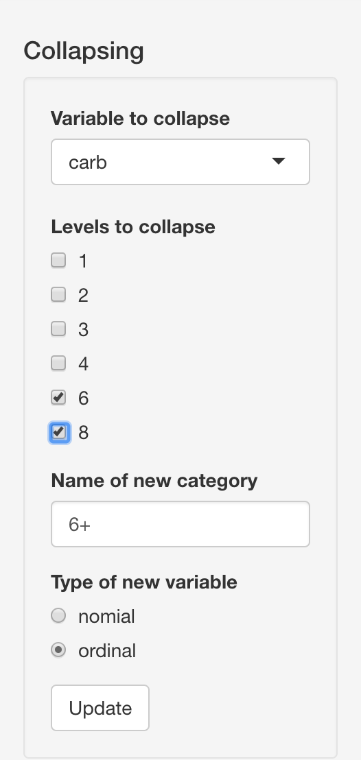 All operations are done under the “Collapsing” section on the left input panel. User can select the variable to operate on, and a list of all unique values will show up reactively under “Levels to collapse”. User can then select all the values to bin, specify a name of the new binned level, and specify whether the new binned variable should be coded as nominal or ordinal.