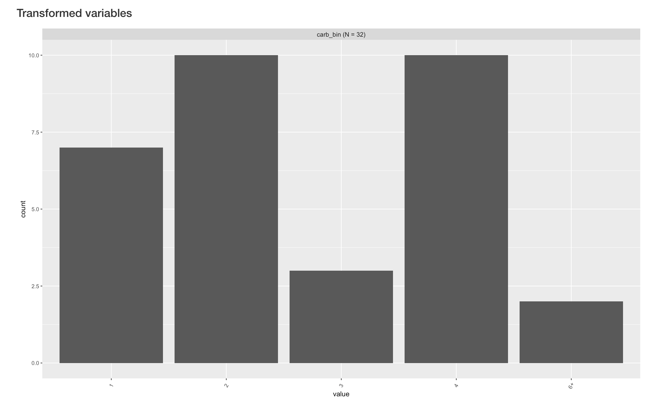 For an existing categorical variable, this tabs supports binning existing levels into a new levels, which is particularly useful when a variable can take may different value with small sample size at each value. Below we present an example of binning the “carb” variable (number of carburetors).