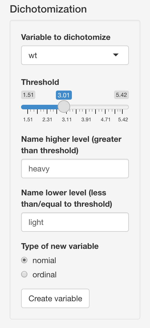 This tab also supports create a new binary variable based on numeric variables in the dataset. Relevant operations are implemented under the “Dichotomization” section on the left. User can select a numeric variable to dichotomize, and the threshold bar will be updated reactively to the range of chosen variable. User can then choose the threshold for dchotomization, name the to new levels and specify the type of new binary variable.