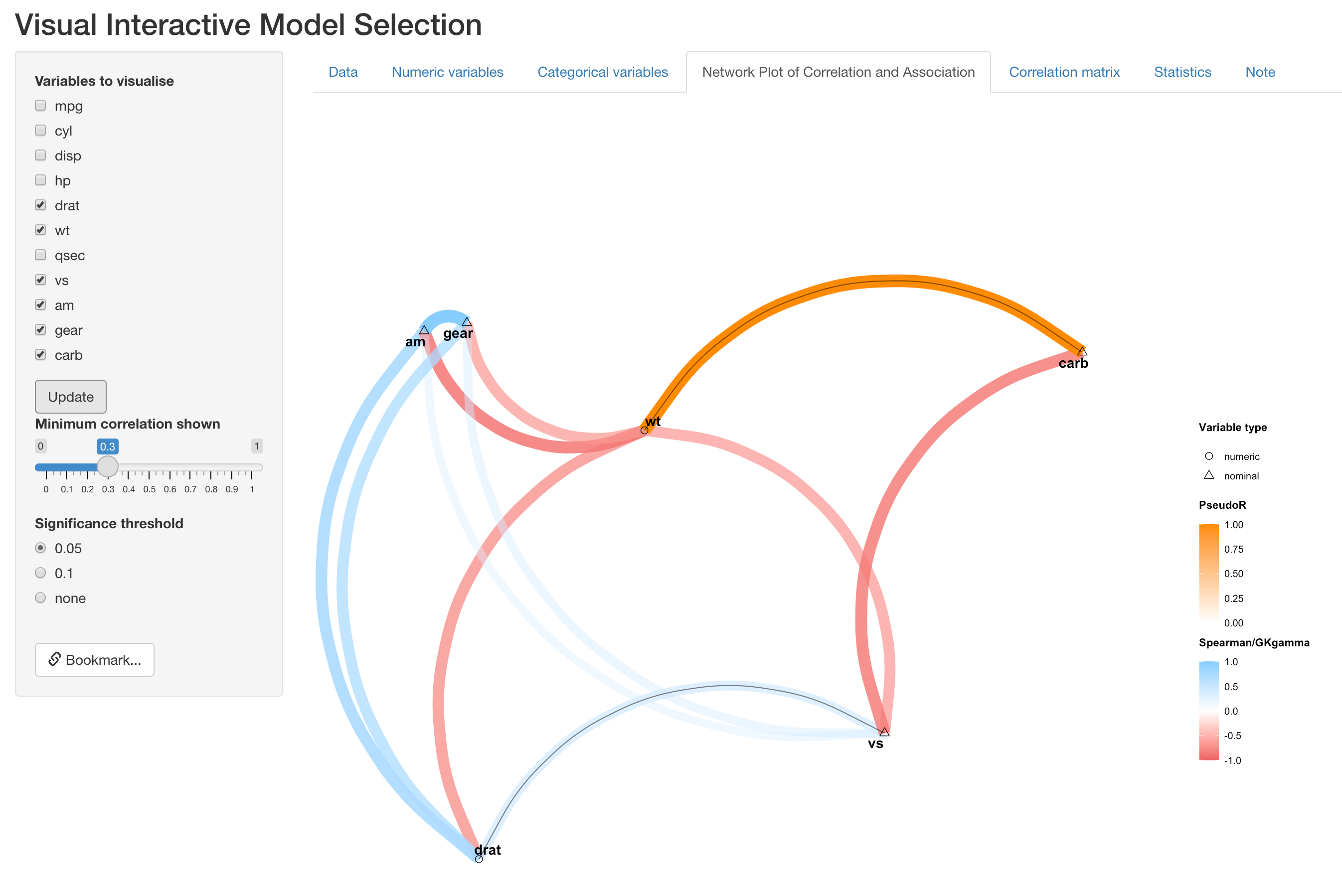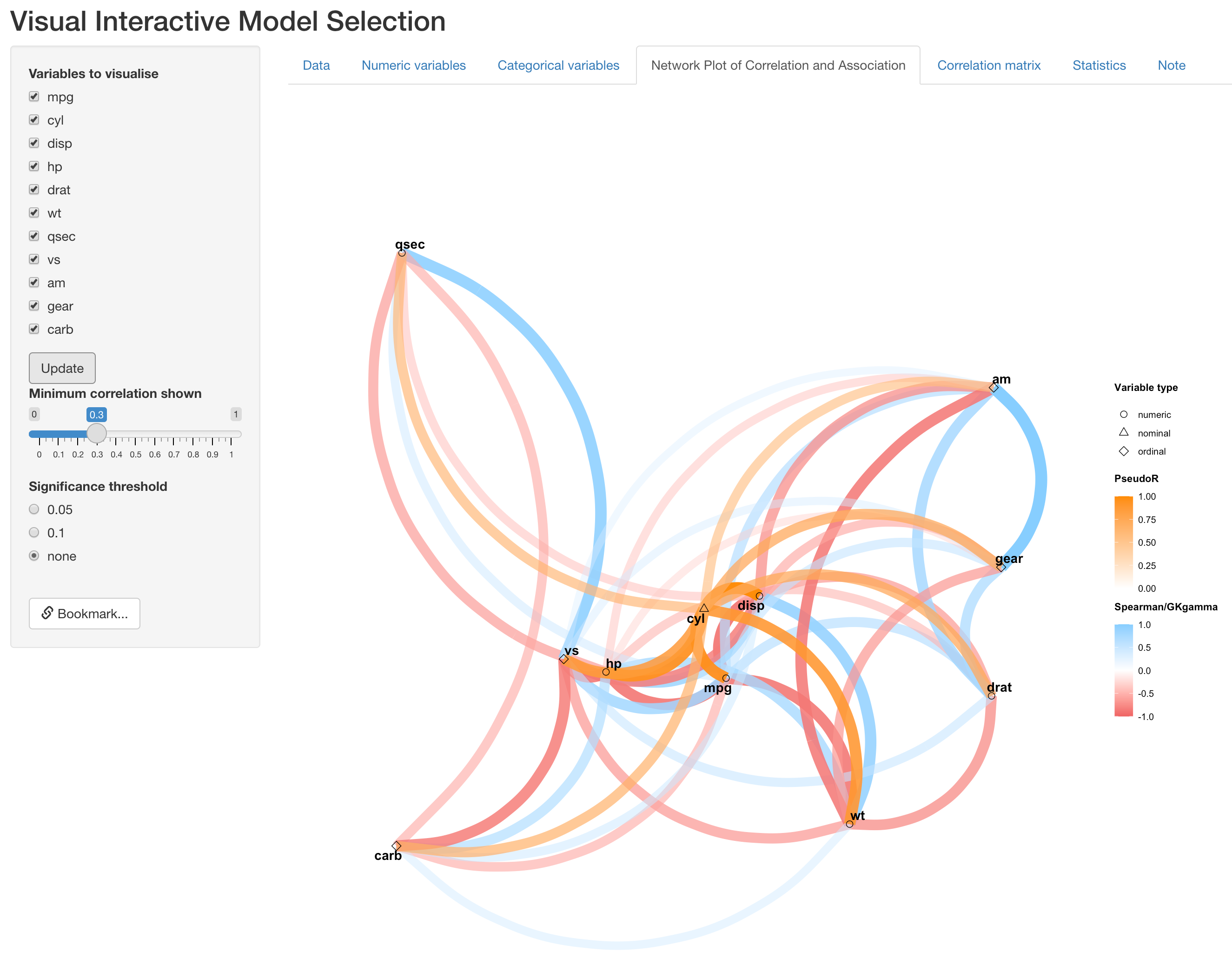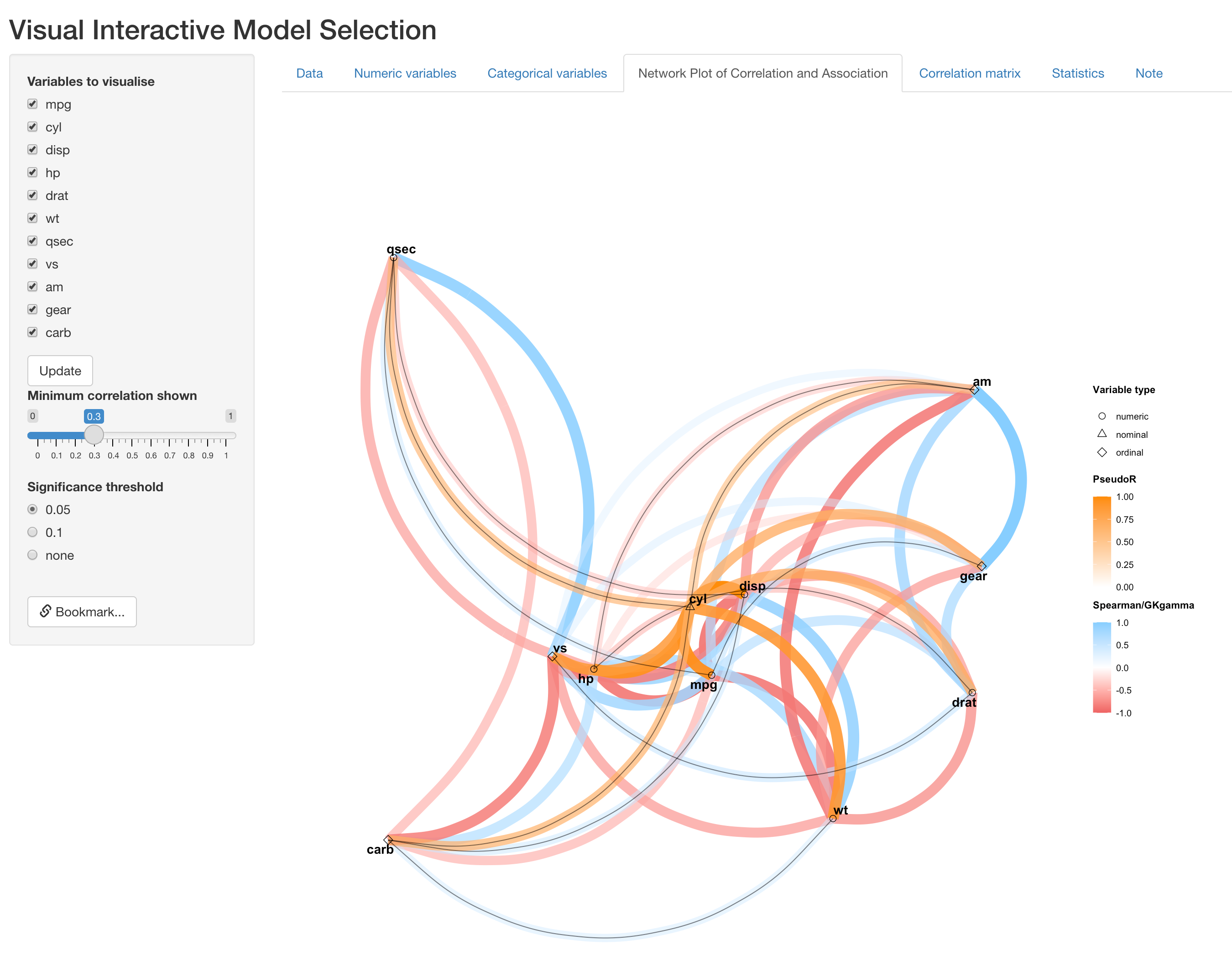 The use of different types of variable and correlation/association measures allows us to treat variable properly, instead of arbitrarily creating numeric dummy variables for nominal variables. The visualization scheme has also been updated with the addition of this new feature, which is explained in the example below: