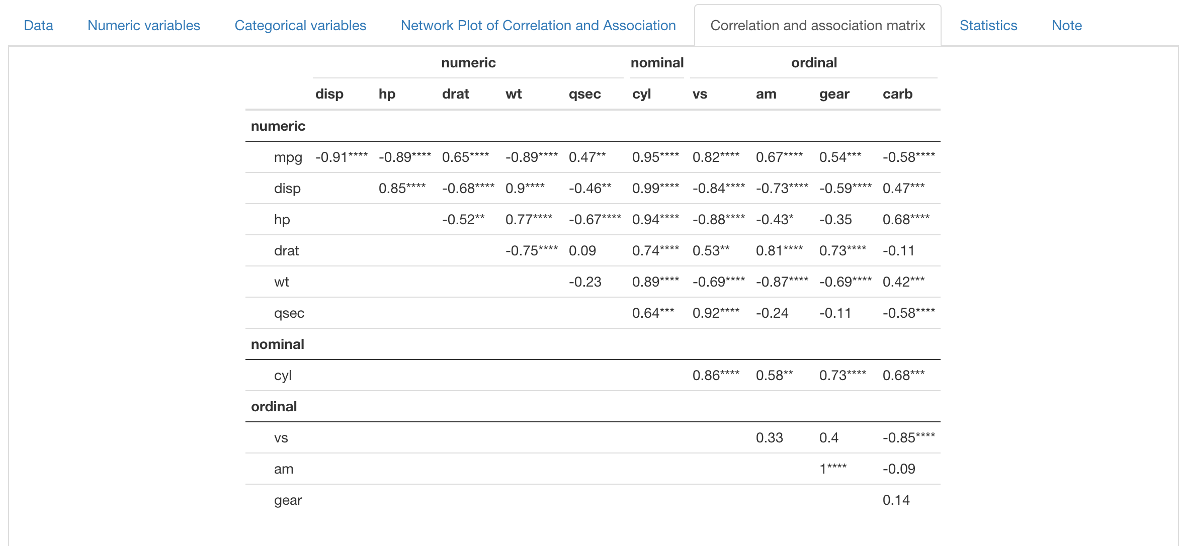 The next tab presents a diagram for pairwise similarity between all variables currently in the dataset, which is the major advance from the previous version. In this new diagram, measure and test of association/correlation between a pair of variables is determined by their types, specifically as follows: