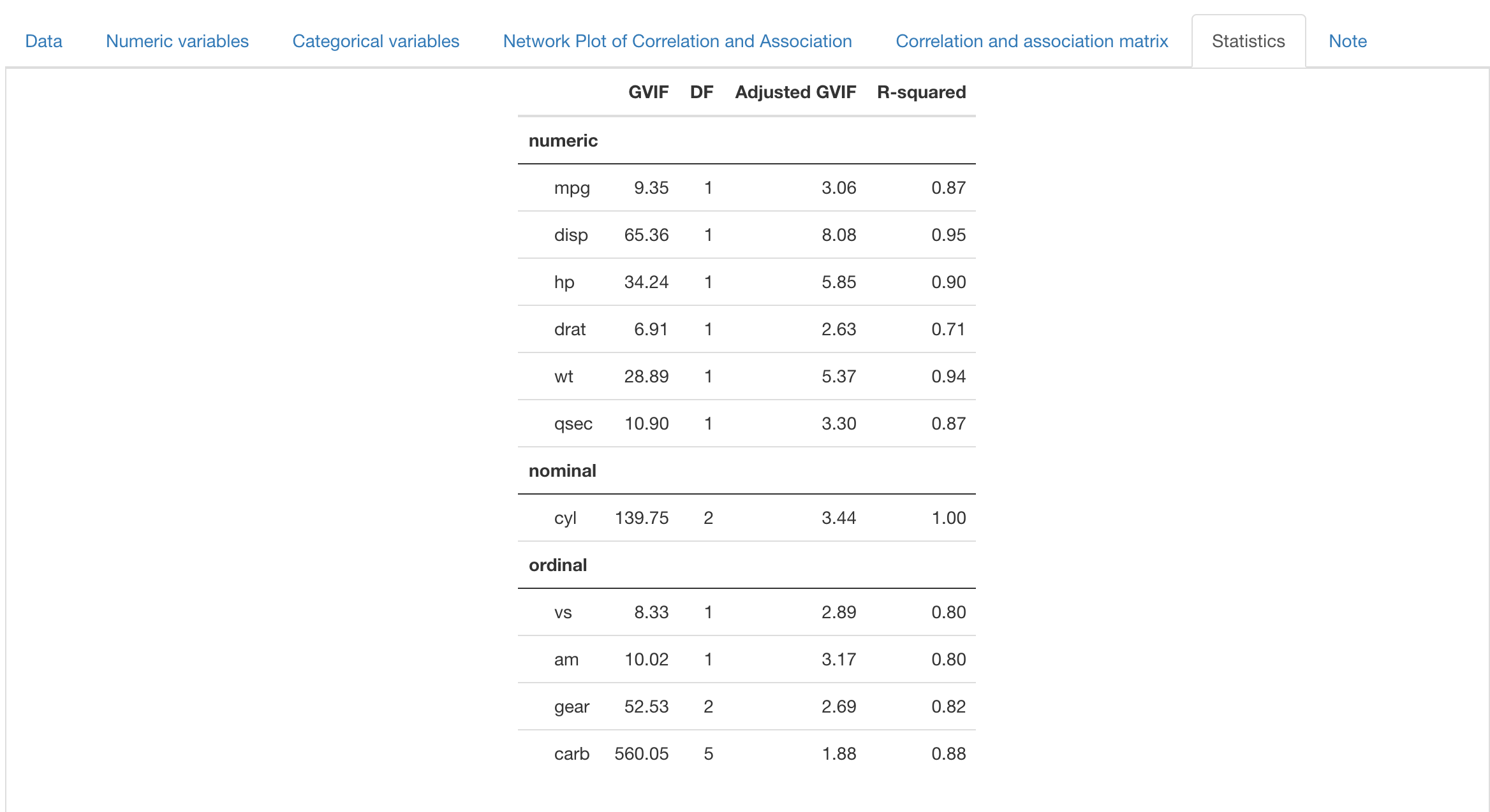 The “Statistics” tab presents statistics about multicollinearity, including Generalized Variance Inflation Factor (GVIF), before and after adjustment for degress of freedom. R-squared for each variable versus all other variables are also presented. However, for numeric and ordinal variables, R-suqared is extracted for mulitple linear regression, while for nominal variable this quantity is in fact Pseudo R-squared from multinomial regression.